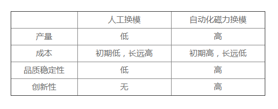 自動化已成為當今世界各國技術創新和經濟發展競爭的焦點;從大家提及的自動化生產單元、自動化生產線、無人車間、黑燈生產、以及所謂的“機器換人”等話題皆為自動化,似乎工廠無自動化設備就不與時俱進了。當然注塑機磁力換模也由傳統換模方式【人工換?!扛倪M為【自動化磁力換模】了,下面表格為人工換模與自動化注塑機磁力換模的對比: