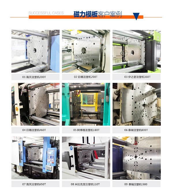 該系統(tǒng)的特點(diǎn)是:結(jié)構(gòu)和控制非常簡單,沒有任何機(jī)械的夾緊元件和動作,在模具背板與吸盤磁極的接觸面上,無論是中心還是外圍,都有電永磁夾緊。 適用于各種形式,規(guī)格的注塑機(jī)。